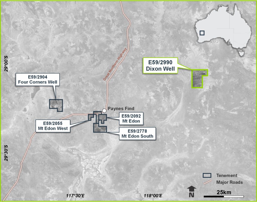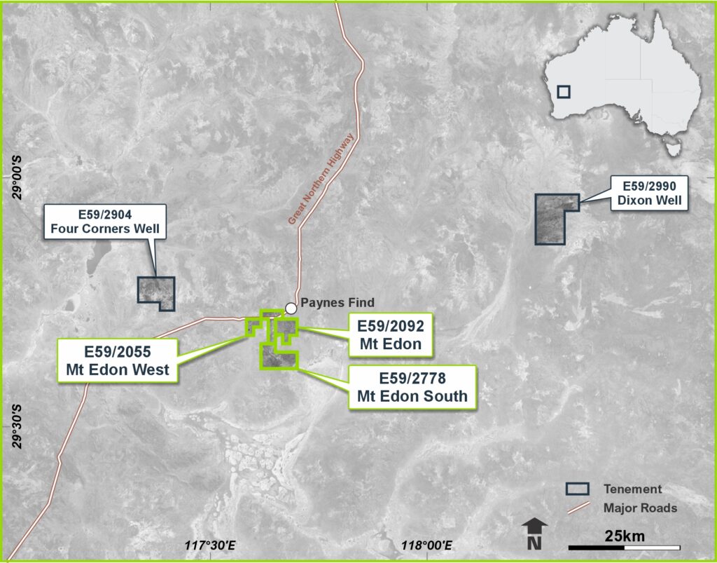 The Mt Edon Project is located approximately 5 km southwest of Paynes Find in Western Australia’s Mid West region. The project hosts a series of highly fractionated rare-metal pegmatites enriched in rubidium and lithium, representing one of the few documented rubidium-dominant systems in Australia.
