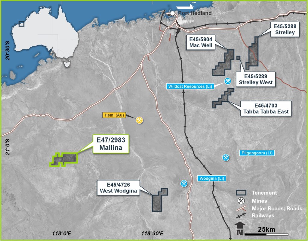 The Mallina Project is situated approximately 80 km southwest of Port Hedland within the northern Pilbara region — a district that hosts world-class lithium deposits such as Wodgina and Pilgangoora. The project encompasses a series of under-explored greenstone and granitic terrains with known pegmatite intrusions, providing exposure to a proven lithium corridor.