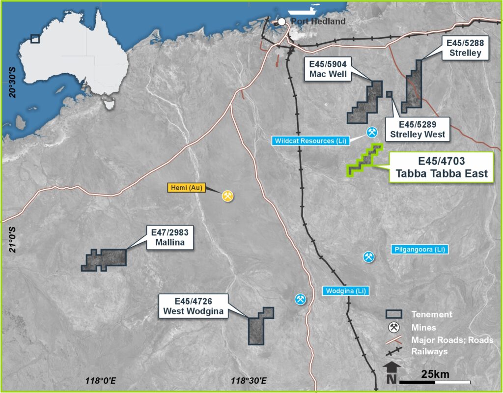 The Tabba Tabba Project lies within the Pilbara lithium province, adjacent to Wildcat Resources’ lithium development and within the broader Pilgangoora–Tabba Tabba greenstone belt. The project covers prospective structural corridors that host lithium-caesium-tantalum (LCT) pegmatites associated with fertile granitic intrusions.